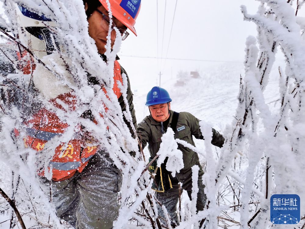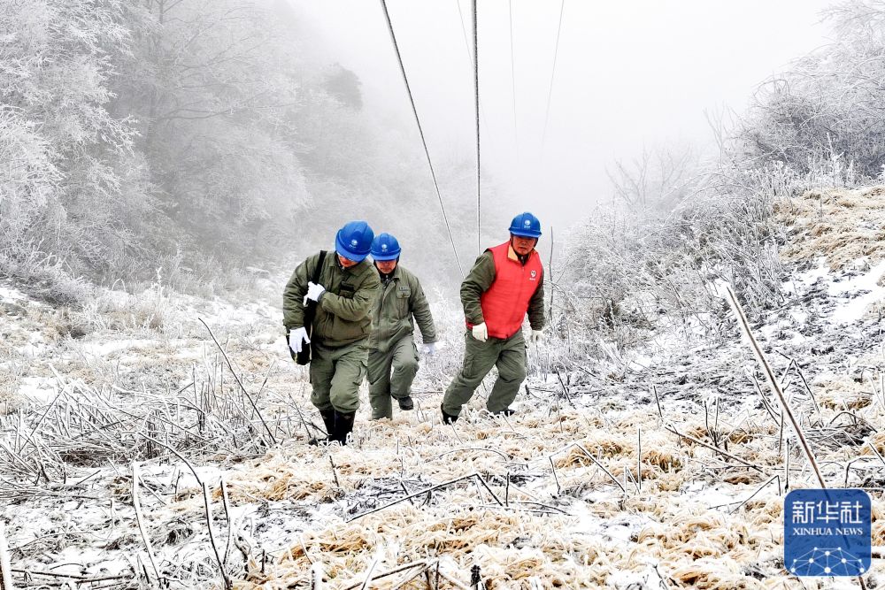 ↑2月3日,在湖北宜昌長陽縣火燒坪鄉(xiāng),國網(wǎng)宜昌供電公司工作人員在巡查覆冰線路。新華社發(fā)(呂清元 攝)