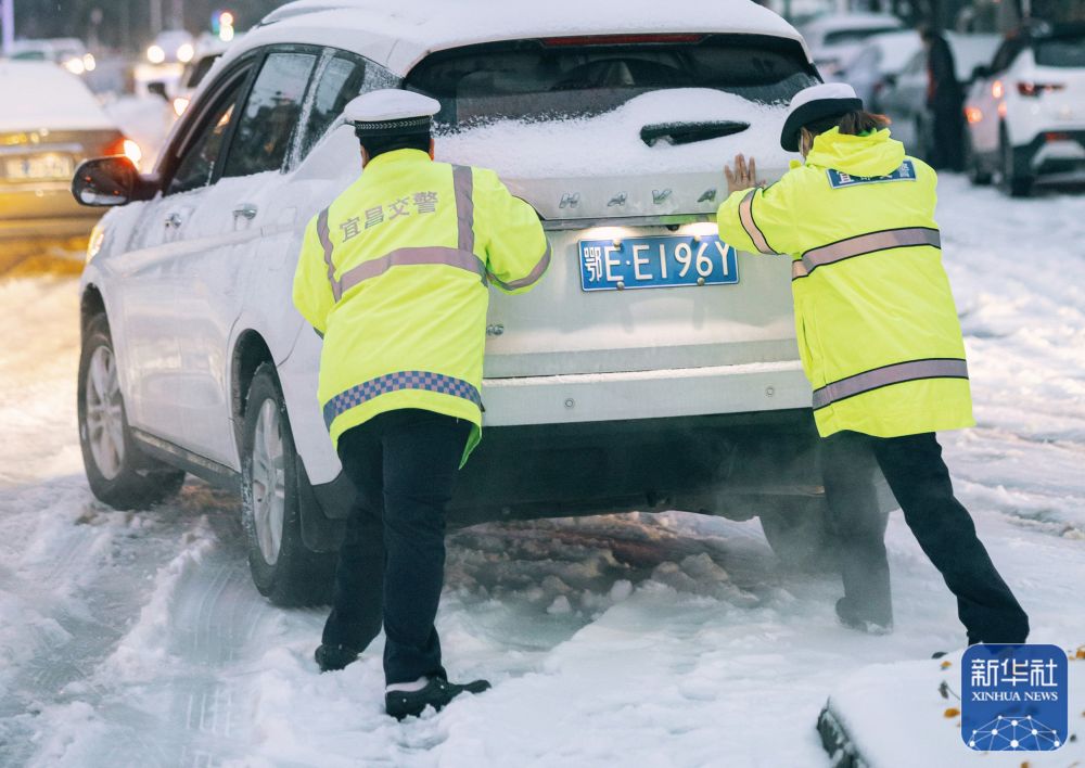 ↑2月3日,在湖北宜都,民警在雪中幫助市民推車脫困。新華社發(fā)(吳昊 攝)