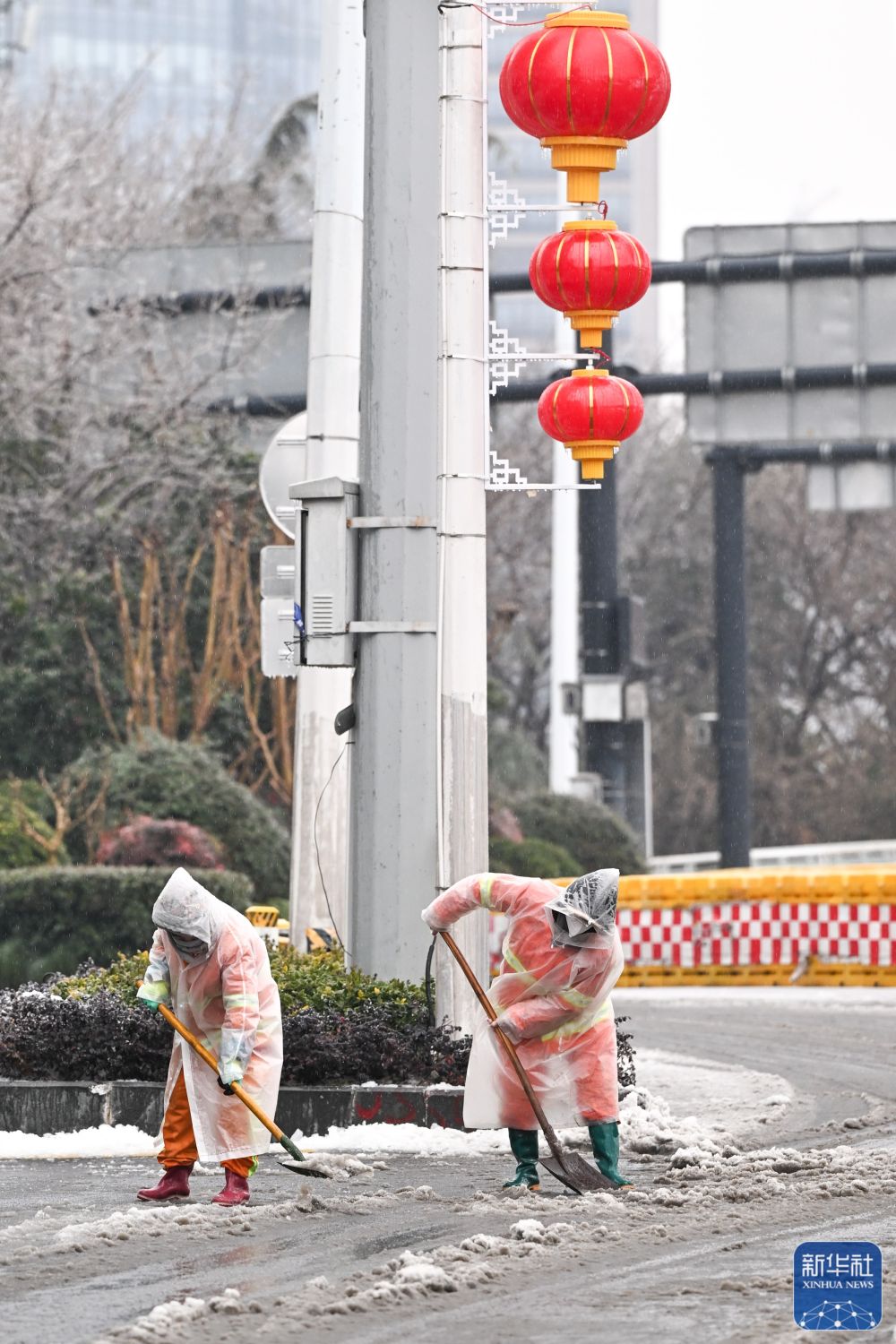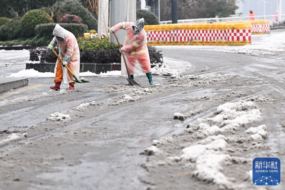 ↑2月3日,在湖北武漢武昌區(qū),環(huán)衛(wèi)工人在清雪。新華社記者 肖藝九 攝