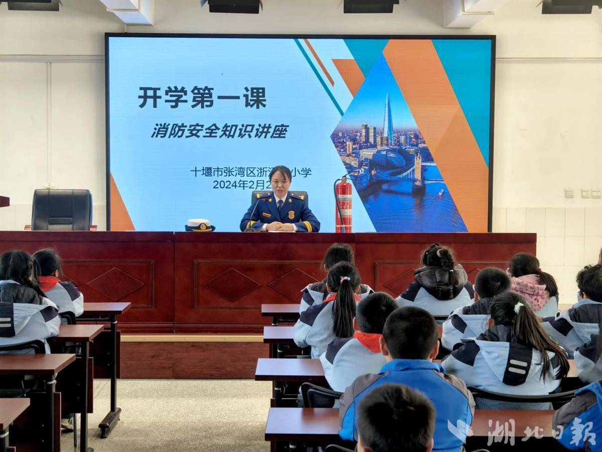 消防人員在十堰市張灣區(qū)浙江路小學(xué)開展“開學(xué)第一課”消防安全知識(shí)講座。通訊員柯賢麗攝