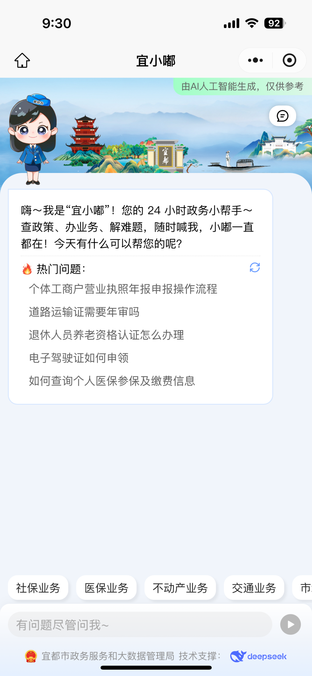 “宜小嘟”以DeepSeek等AI大模型技術(shù)作為核心引擎,深度融合自然語言處理、機(jī)器學(xué)習(xí)等前沿技術(shù),通過搭建跨領(lǐng)域知識(shí)整合平臺(tái),集成政務(wù)信息收集、分析、更新模塊,打造動(dòng)態(tài)更新的政務(wù)服務(wù)“智慧大腦”,為智能政務(wù)服務(wù)筑牢了技術(shù)根基。圍繞社會(huì)事務(wù)、企業(yè)開辦、公積金、不動(dòng)產(chǎn)登記等高頻熱點(diǎn)領(lǐng)域,梳理并整合了人社、醫(yī)保、公安、稅務(wù)、市場(chǎng)監(jiān)管等34個(gè)部門的1962余項(xiàng)政務(wù)服務(wù)辦事指南、300余個(gè)高頻事項(xiàng)政策文件及常見問題,憑借其先進(jìn)的語義識(shí)別算法,通過反復(fù)問答訓(xùn)練后能夠精準(zhǔn)理解用戶意圖,辦事群眾只需提出問題,就能得到準(zhǔn)確且清晰的解答,為群眾和企業(yè)帶來了人工智能時(shí)代的政務(wù)服務(wù)全新體驗(yàn),顯著提升了服務(wù)便捷性。