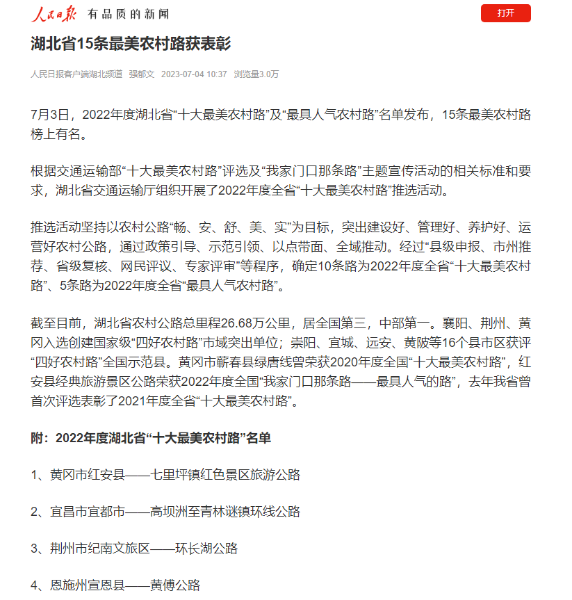 日前,在湖北省交通運(yùn)輸廳主辦的2022年度湖北省“十大最美農(nóng)村路”評選活動中,由宜都市交通運(yùn)輸局推送的高壩洲至青林謎鎮(zhèn)環(huán)線公路綜合排名全省第二。