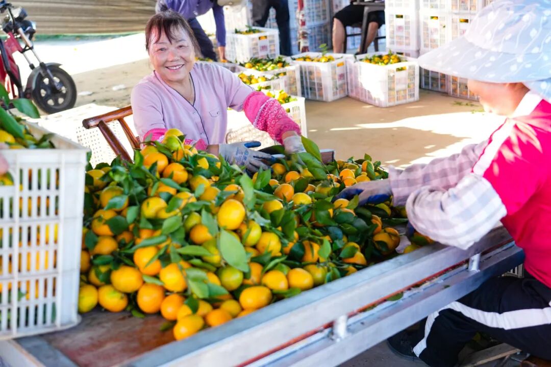 道路兩邊,果農(nóng)們穿梭其中。采果、挑運有序進行,一派豐收景象。